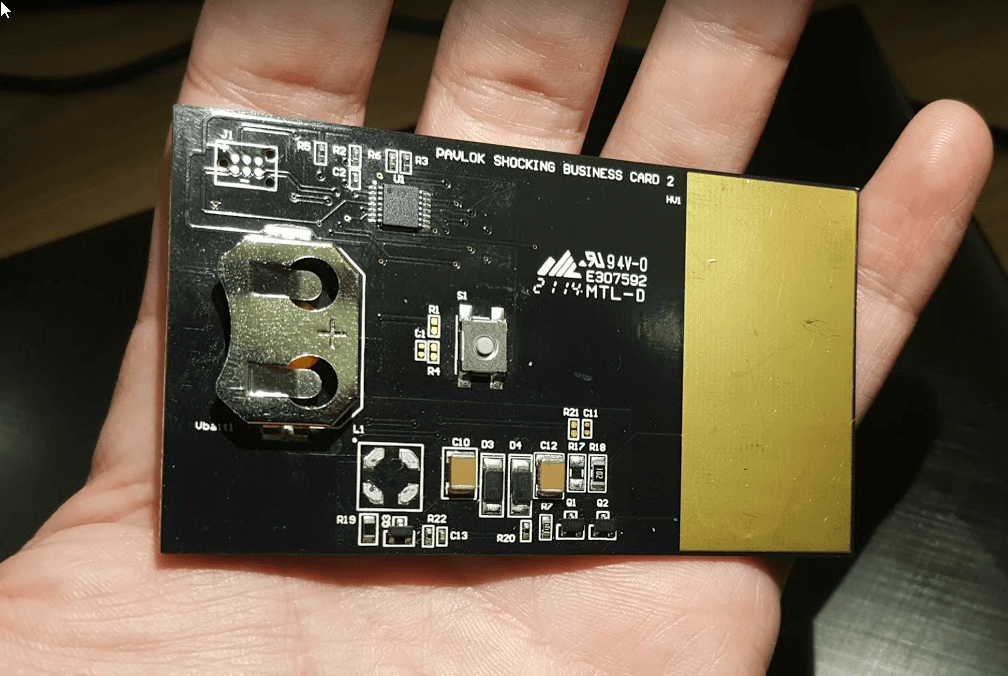 What you’re looking at is the very first prototype of our shock circuit. If you’ve got eagle eyes, you might notice something a little curious about the top photo – the tiny silkscreen text on the back of the circuit board says “Pavlok Shocking Business Card.” We figured that as long as we were making a prototype shock circuit, why not design it in the form of a shocking business card? The lightning bolt on the front and the big pad on the back serve as the electrodes. If you really want to make an impression at a networking event, you can hit the “shock” button on the card just as you’re handing it over to your latest contact.